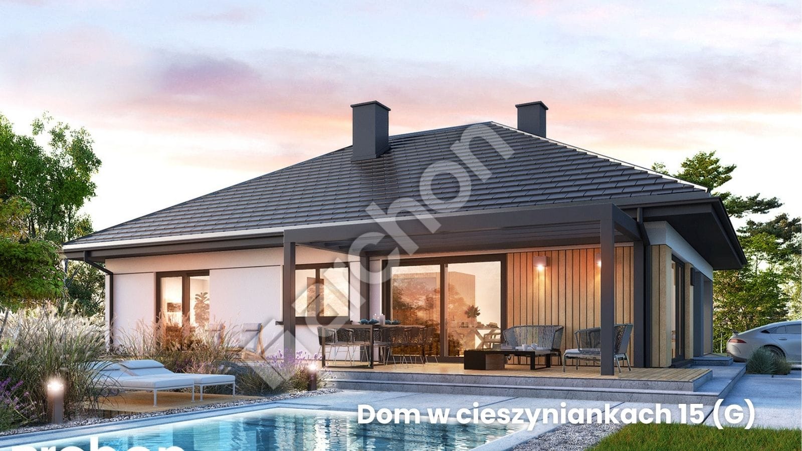 Projekt Domu w Cieszyniankach 15 (G) to propozycja dla inwestorów, którzy pragną wygodnego domu jednorodzinnego na jednym poziomie, z wyraźnie wydzieloną strefą dzienną i nocną, a jednocześnie cenią sobie nowoczesny design. To parterowy budynek z garażem w bryle, przykryty czterospadowym dachem, z komfortową powierzchnią użytkową i licznymi udogodnieniami.